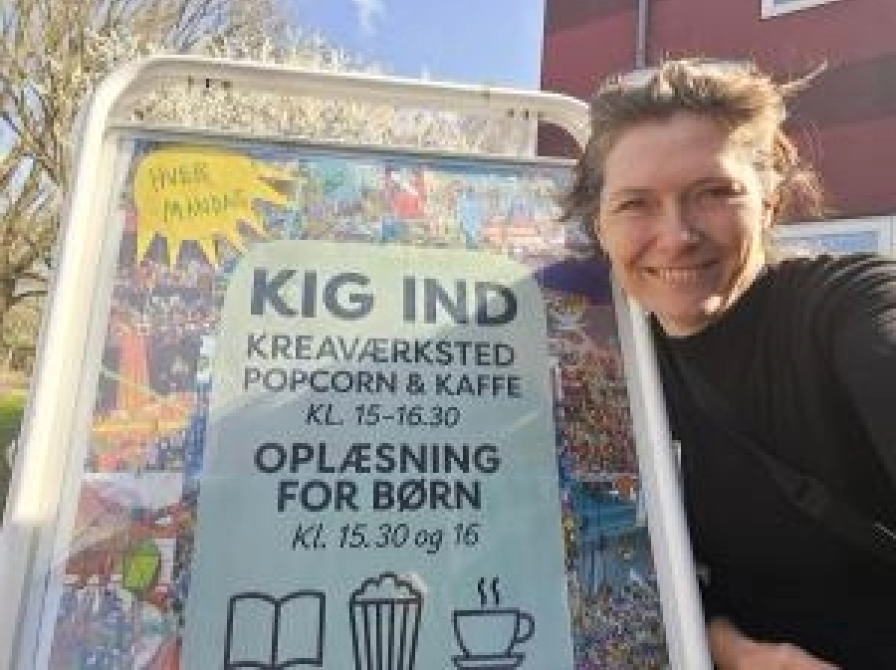 Der er åbent kreaværksted, popcorn og kaffe, og Børnekulturformidler Sanne inviterer til oplæsning for børn kl. 15.30 og kl. 16. Kom og vær med – I kan komme og gå, som det passer jer. Oplæsningen er rettet børn i alderen 2-6, men alle er velkomne.