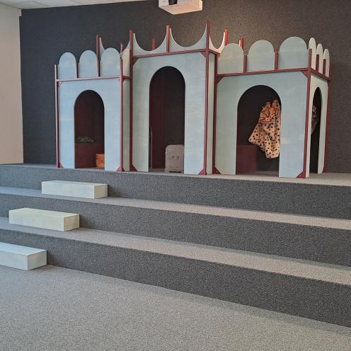 Børnebibliotekets scene, Teatertrappen, har plads til 30-40 mennesker, som kan sidde på trapperne. Der er plads til, at man kan deltage med kørestol; her er der en lille forhøjning op på gulvtæppet, på et par cm.